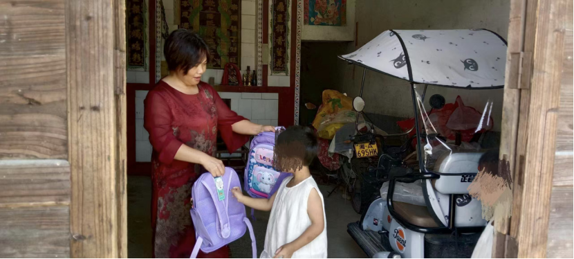 在隆回县高平镇大石村,村里的人大代表兼党支部书记拿着崭新的书包,递给了事实无人抚养儿童。孩子看着新书包,脸上露出了开心的神情。